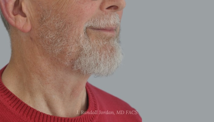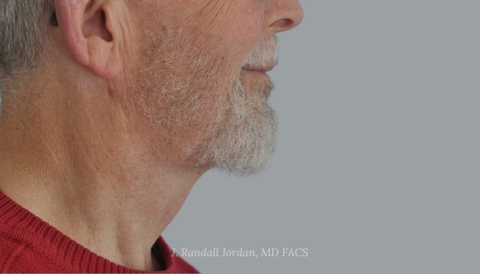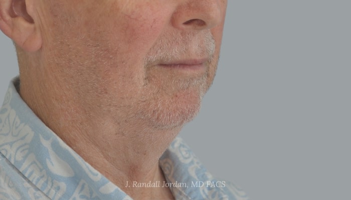Before: This 69-year-old gentleman desired a more youthful neck and lower facial profile. Dr. Jordan recommended a chin implant (Chin Implant Case 2) and Acculift RF to improve both the strength of the chin and the jawline contours using a minimally invasive approach—a 1-inch incision under the chin that would not be visible.