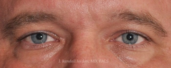 Before- This man was bothered by the bags beneath his eyes. He had some fat herniation but very little excess skin or wrinkling. He was felt to be a good candidate for a trans-conjunctival blepharoplasty where the incisions are hidden on the inside of the lower eyelids.