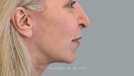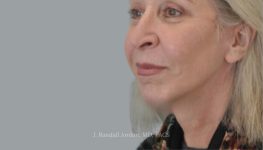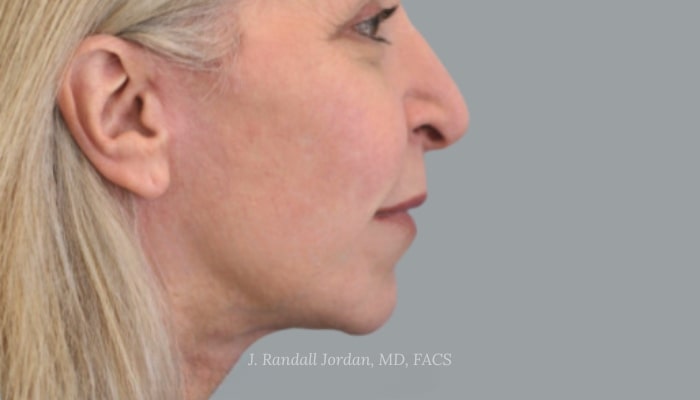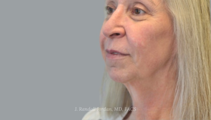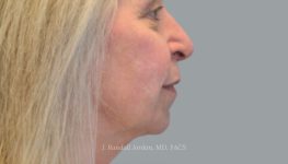 Before: This very pleasant lady had recently lost a good bit of weight and desired facial rejuvenation. A chin implant along with a facelift, cheek implants, and upper and lower blepharoplasty were recommended to achieve her aesthetic goals.