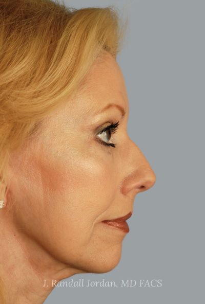 Before: This very nice woman was unhappy with the shape of her lower face and felt it made her look tired and unhappy. We recommended a facelift and an upper and lower blepharoplasty.