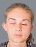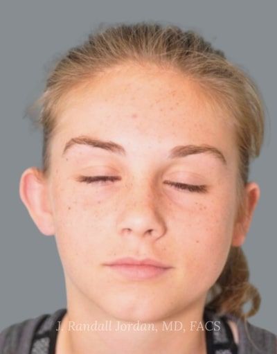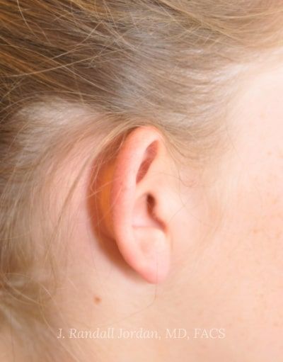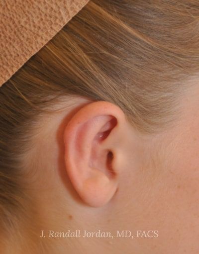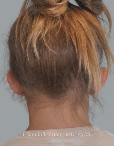 Before: A bit older girl with one ear more prominent than the other. She underwent a unilateral right otoplasty.